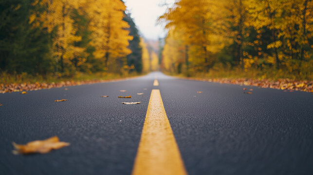 Road through Autumn Canopy: An asphalt road stretches into the distance, flanked by trees displaying vibrant yellow foliage. A fallen leaf lies on the pavement, marking the change of season.