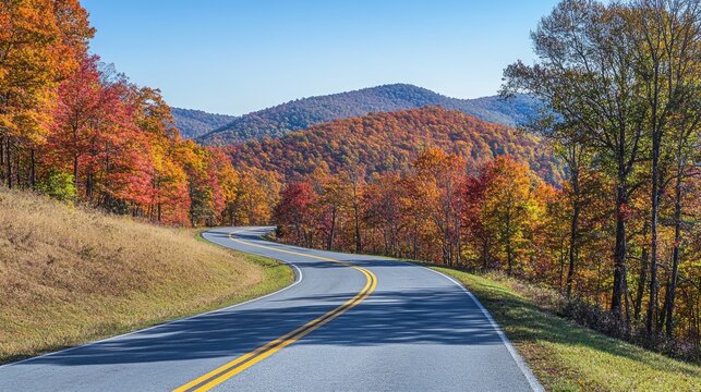 Long way road. Distance, asphalt, sky. Let's hit the road! A road disappears in to the the wide open blue sky, highway, road through colorful forest