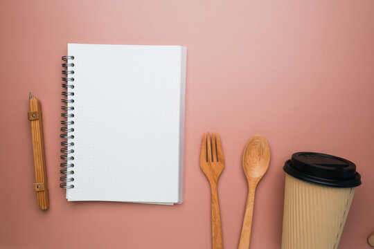 The mock-up notebook with spoon, fork, and coffee cup for meal plan, diet, cooking, recipe, menu, and template.
