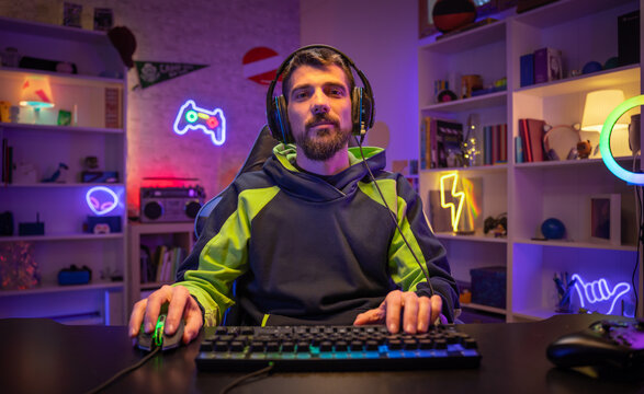 Happy gamer portrait playing games on the computer looking at camera while streaming gaming room.