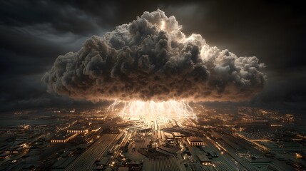 A massive storm cloud looming over a fragile circuit board, symbolizing technological vulnerability.