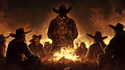 The shadowy figure of a bronco rider their bandana and shirt adorned with tribal patterns and animal skulls looming over a coven of witches gathered around a blazing . Witch Coven. Illustration