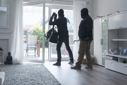 Two burglars leaving an one-family house with their loot at daytime