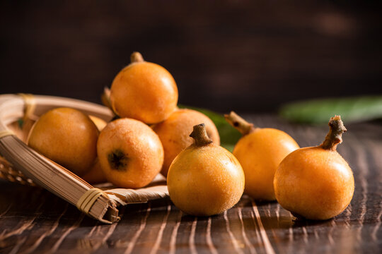 ripe loquat fruit on wooden table