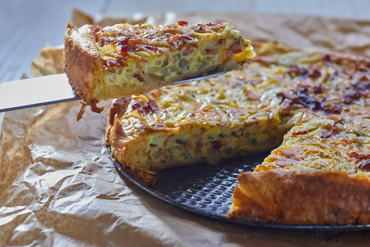 Traditional french pie with bacon and cheese - quiche lorraine.