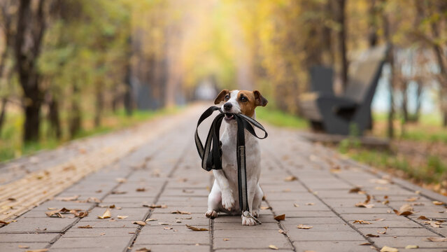 Jack Russell Terrier dog holding a leash for a walk in the autumn park.