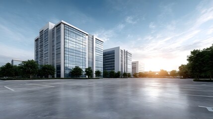Modern office complex with a vast empty parking lot under a clear blue sky with warm sunlight
