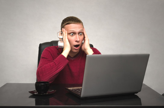 A young caucasian man in glasses working at a laptop at the table and in shock from what he saw at computer monitor. Man Looks amazing movie. Special offer. Big sale (discount) concept.