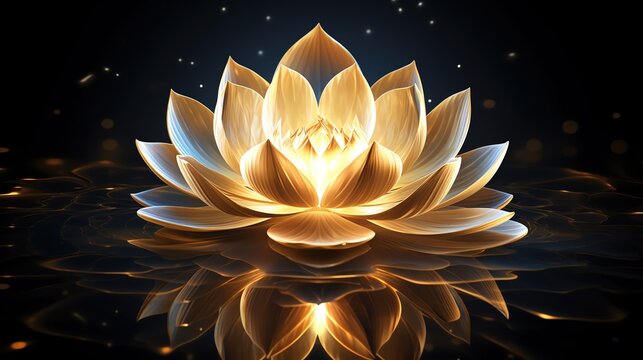 A serene golden lotus flower floating on calm water, symbolizing tranquility and purity in a beautiful, dark setting.
