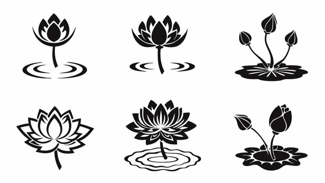 Collection of six stylized lotus flower illustrations in black and white with water ripples design editable eps vectors silhouette