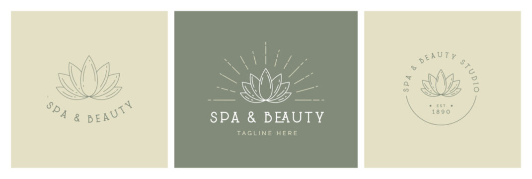 Spa and beauty studio concept. Vector outline illustration set. Boho style. Lotus flower yoga symbol and text on green and gray background. Design layout template for poster, card