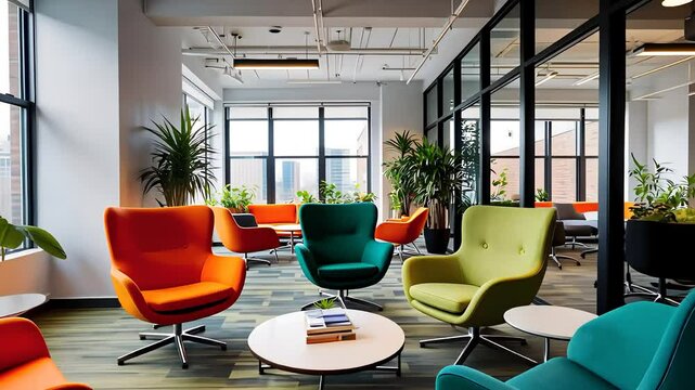 The lounge is welllit with soft natural lighting from the large windows creating a warm and inviting atmosphere.