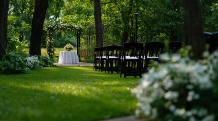 A wedding ceremony is taking place in a lush green park. The ceremony is taking place under a canopy of trees, with a beautiful archway in the middle. The chairs are arranged in rows