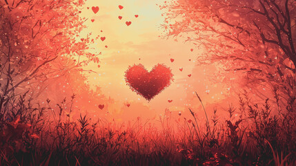 Heart Shaped Tree in Enchanting Forest Landscape for Valentine's Day Celebration, Romantic Nature Scene with Love Symbolism and Vibrant Colors, Perfect for Seasonal Marketing and Decor