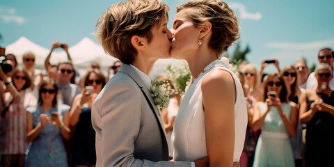 wedding celebration where same-sex couples share hugs and kisses during the ceremony. Generative AI