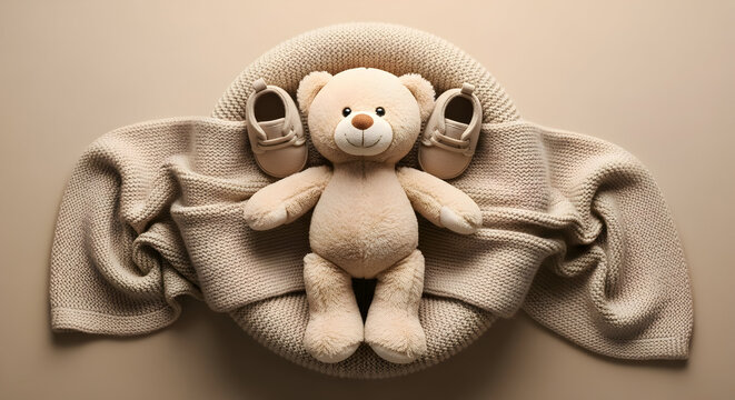 Teddy bear, baby shoes and knitted blanket, adorable baby announcement concept