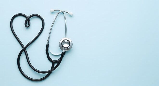 Stethoscope Shaped like a Heart on a Blue Background with Copy Space.