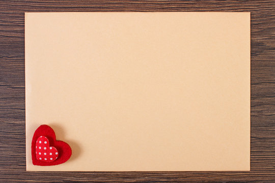 Envelope or letter and red heart on rustic wooden table for love message on Valentines Day in retro toning.