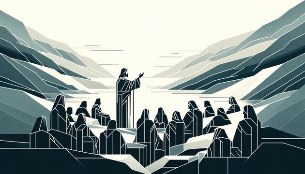 Jesus preaching in Galilee and gathering his disciples. Life of Jesus. Digital illustration. Vector illustration in retro style