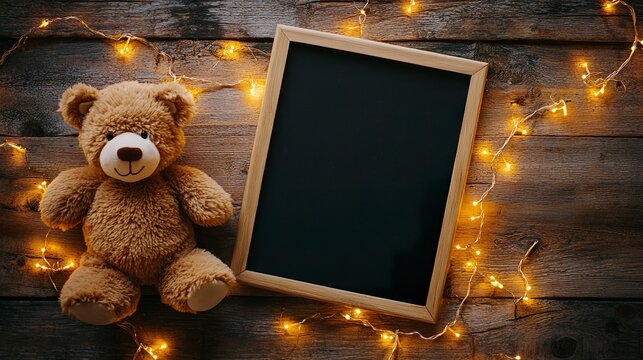Rustic fall-themed pregnancy announcement, black letter board with bold white text, golden fairy lights creating warmth, plush teddy bear on a wooden floor, top-down view