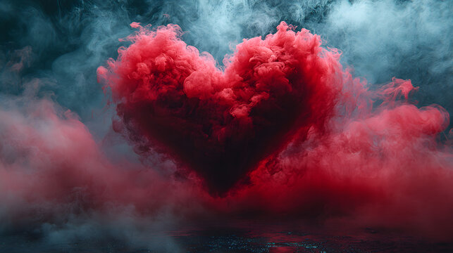 Powerful red smoke cloud forming a heart shape against a moody backdrop of mist and shadows. A striking and symbolic representation of love and intensity.