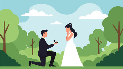 Flat vector romantic scene of proposal with groom kneeling and bride reacting with joy, perfect for wedding storytelling and relationship visuals
