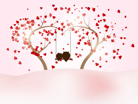 illustration of romantic valentines day with couple owl on swing at tree of love and heart flying vector background