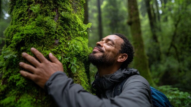 Man hugging tree in forest.