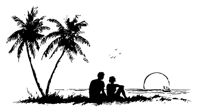 Silhouette of couple sitting under palm trees watching sunset on beach