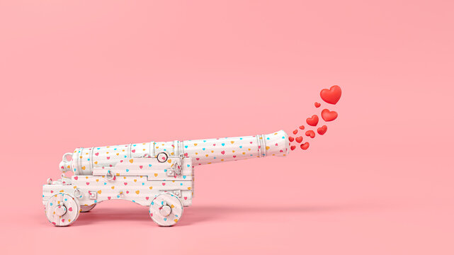 3D Illustration concept of a cannon of love that shoots hearts instead of bombs.  Love wins in the end. Pastel pink background..
