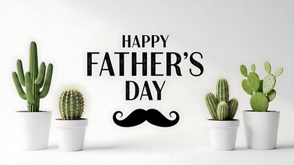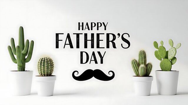Happy father's day greeting with a fun mustache icon and potted cacti arrangement isolated on white background