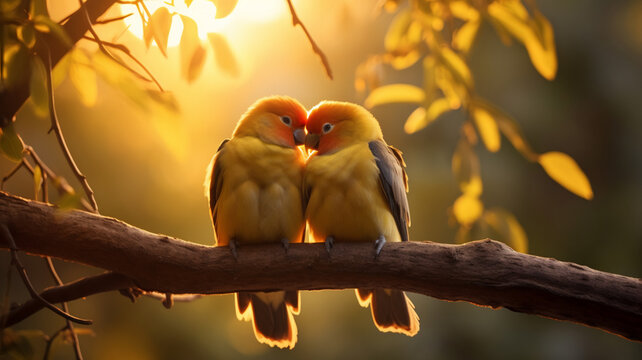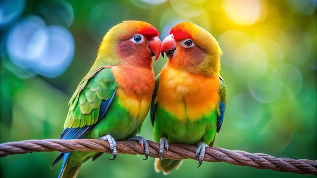 A pair of lovebirds snuggled close on a branch, their vibrant plumage glowing in the soft light