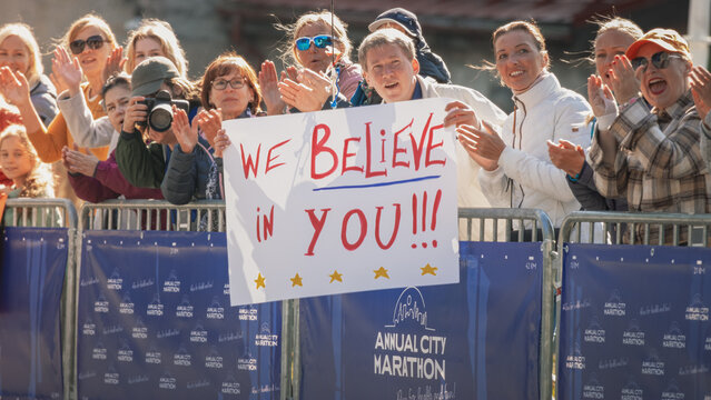 Marathon Supporters Waving at Their Loved Ones During a Sprint. Audience Members Holding Motivational Banners and Cheering