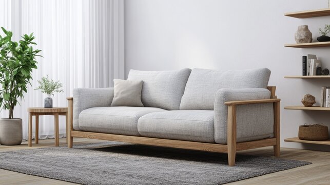 A cozy, light gray loveseat with wooden frame sits on a textured rug, complemented by plants and shelving in a bright, minimalist space
