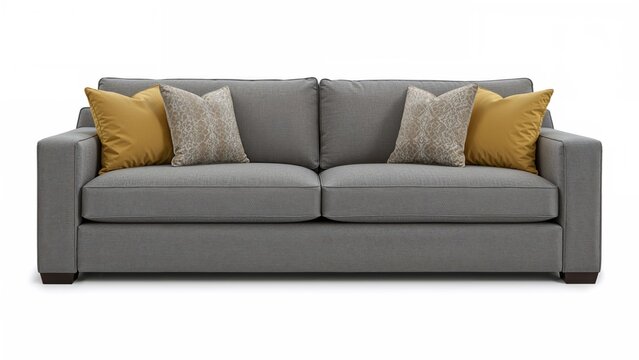 Three-seat grey sofa bed with mid-height backrest on a white setting, fronted by a loveseat equipped with armrests and a seat cushion, complemented by four decorative throw pillows.