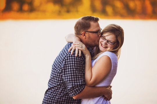 Married couple stand in an embrace and share a kiss beside a lake with autumn colours in the forest in the distance; Edmonton, Alberta, Canada