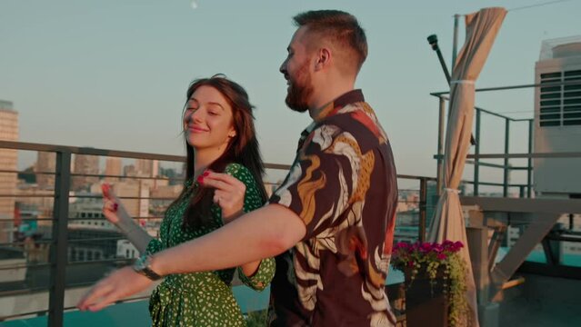 young couple arranged a date on the roof terrace with a view of the city happy lovers