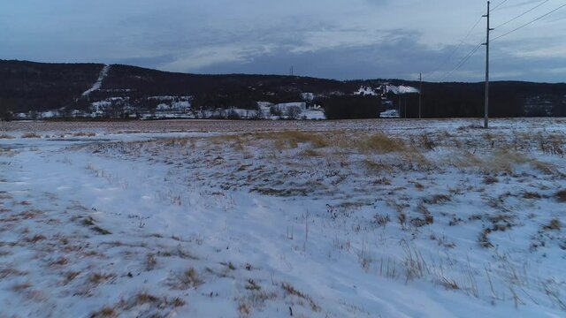 Backwards low flight above rippled water level in industrial landscape with high voltage power lines