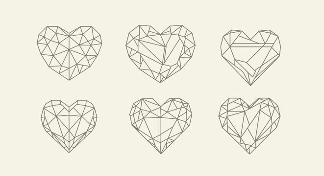 Six geometric heart shapes with a wireframe, low poly design create a modern and stylish graphic element for love, romance, or abstract art.