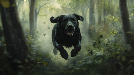 A Labrador retriever racing through a dense forest, its expression focused and determined, portraying a loyal companion on an epic quest