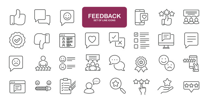 Set of line icons related to feedback, testimonial, review, rating, survey. Outline icons collection