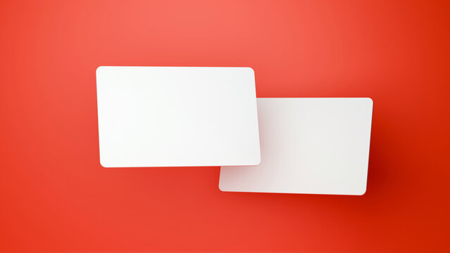 Two blank plastic business cards mockups set isolated on red background. Debit card mock up. Name card design mock up presentation.