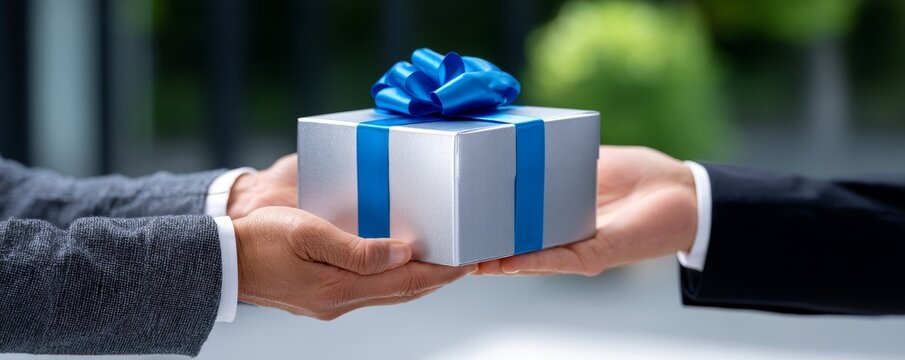 Gifting and Reward, Financial Planning and Budgeting concept. Workplace Appreciation: Employee Receives Gift Box with Name Tag, Reward Strategy Visual