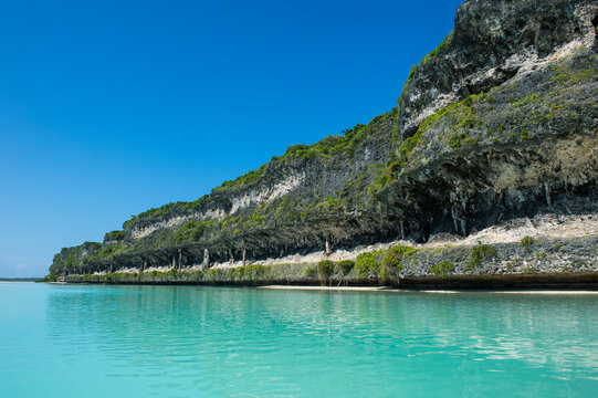 The grey Lekiny cliffs by turquoise sea against clear sky, Ouvea, Loyalty Islands, New Caledonia