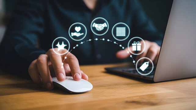 Person using a laptop with virtual icons representing business concepts such as charity partnership gift and loyalty program