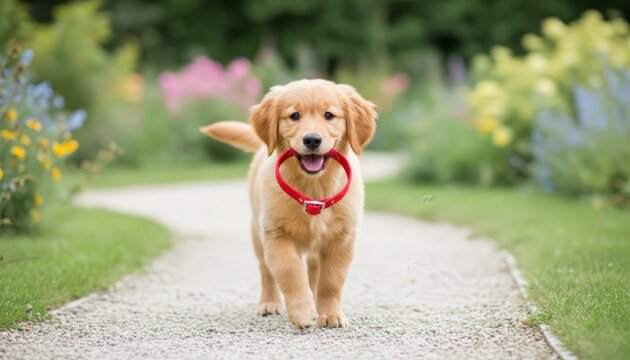 Golden retriever puppy playing happily, walking on a gravel path in a lush green garden, carrying a red collar in its mouth, symbolizing themes of pet companionship and playful joy