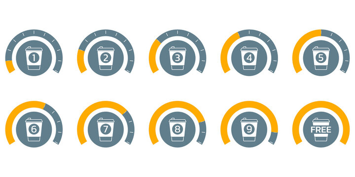 Coffee loyalty card concept with take away coffee cup icons. Buy 9 cups and get 1 for free. Cafe beverage promotion design template. Vector illustration.