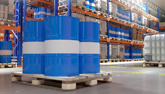 Factory warehouse. Storage of industrial products. Barrels of fuel on pallet. Warehouse interior inside hangar. Storehouse with fuels and lubricants. Interior of warehouse center. 3d image
