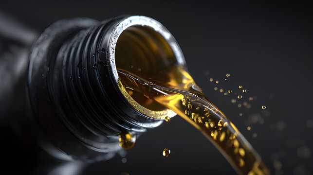 Synthetic engine oil. Engine oil drip bio-ethanol lubricants. Vehicle oil bottle spill. Engine compartment ppm mineral oil. Transmission fluid oil change, automobile pouring oi from a keg container.
