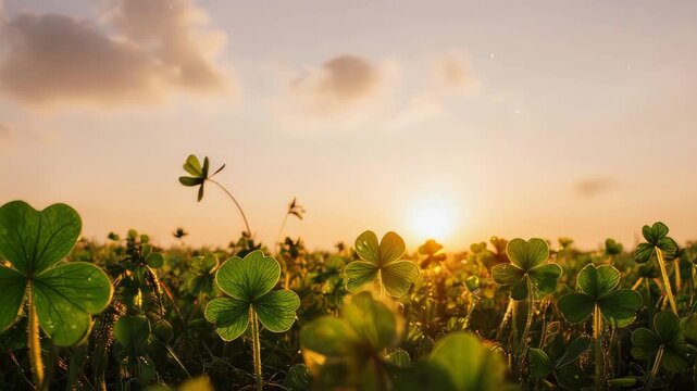 Dew-covered clover leaves in sunlight. Nature and luck symbol concept